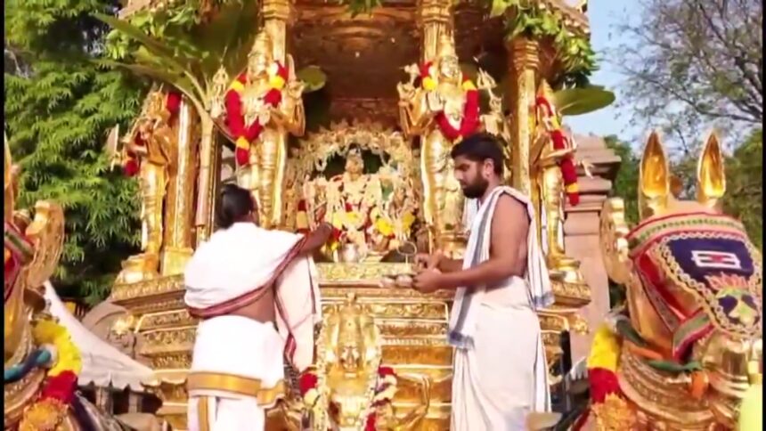 The Swarna Rathotsavam began with special pujas, including Mahanyasa Purvaka Ekadasa Rudrabhisekham and Annabhisekham, after which the golden chariot was pulled around the temple streets. The utsava murtis were seated on the Swarna Rath, draped in silk and gold, offering darshan to rows of devotees lining the route to seek blessings for rain, good crops, peace, and prosperity.