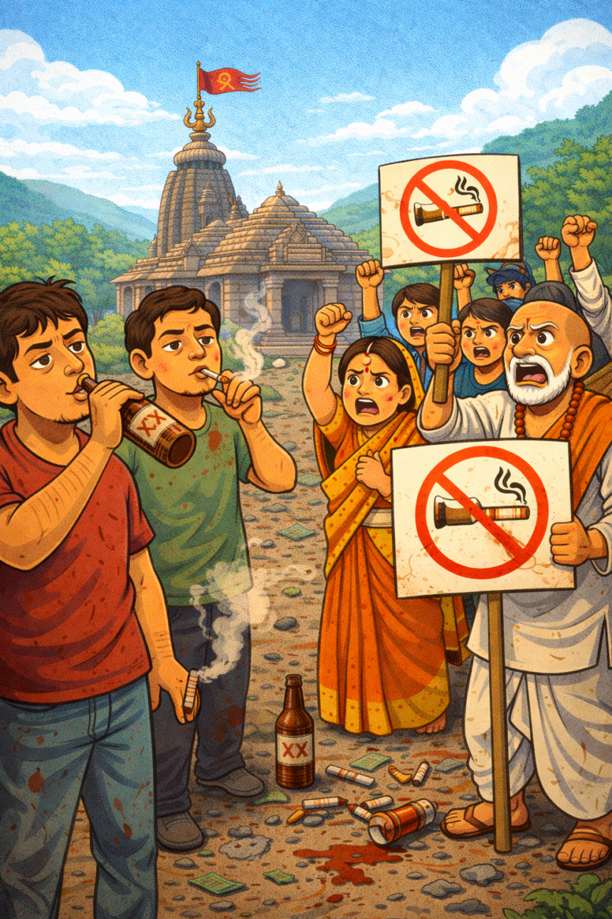 Sacred precincts polluted by alcohol and cigarettes near a Karnataka shrine. Devotees witness tourists flouting sanctity at Chikkamagaluru’s revered temple.