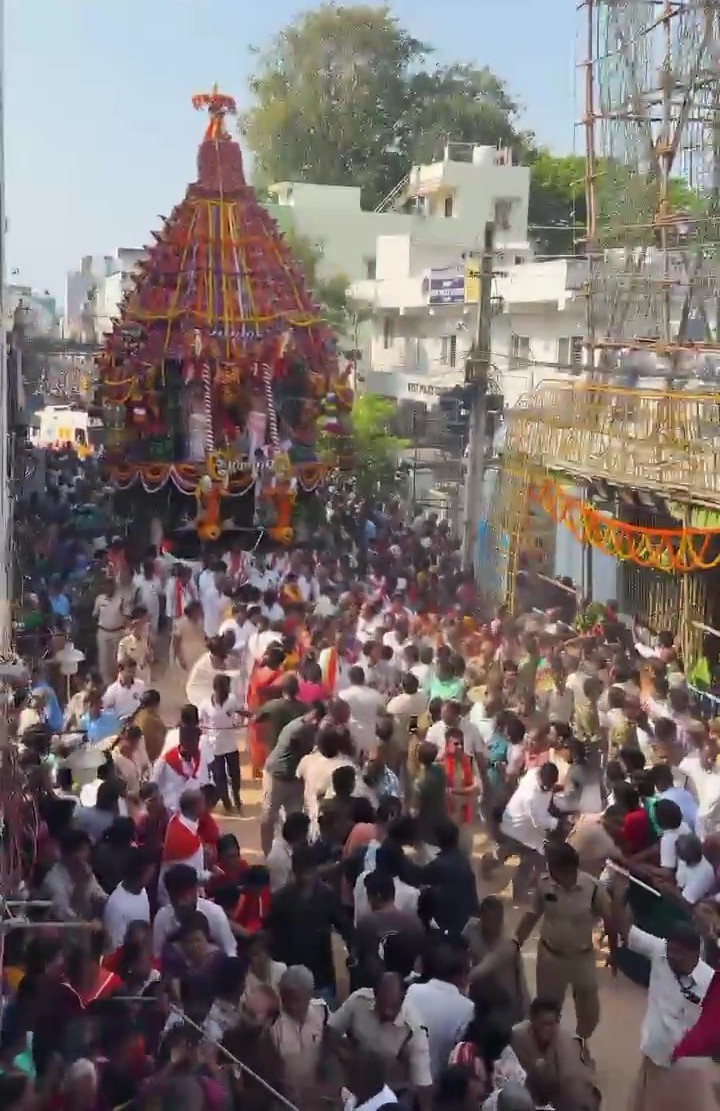 Women offered harathi at every step. Bhajan troupes performed Kolatam folk dances ahead of the chariot. Nalayira Divya Prabandham Tamil verses and Vedic Sathumora chants concluded with the final harathi.