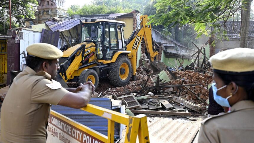 HR and CE Department cleared encroachments from 79 cents of land worth over Rs 100 crore belonging to Varasidhi Vinayagar Temple in Ukkadam, Coimbatore. The land, belonging to a sub-temple of the Lakshmi Narasimha Swamy Temple, had around 22 structures, including residential and commercial units. The Joint Commissioner issued the removal order in 2015, followed by notices to occupants. After appeals to the JC court, then to the Secretary of HR and CE Department, and finally to the Madras High Court, all were rejected, with the HC dismissing the case on November 27, 2025.