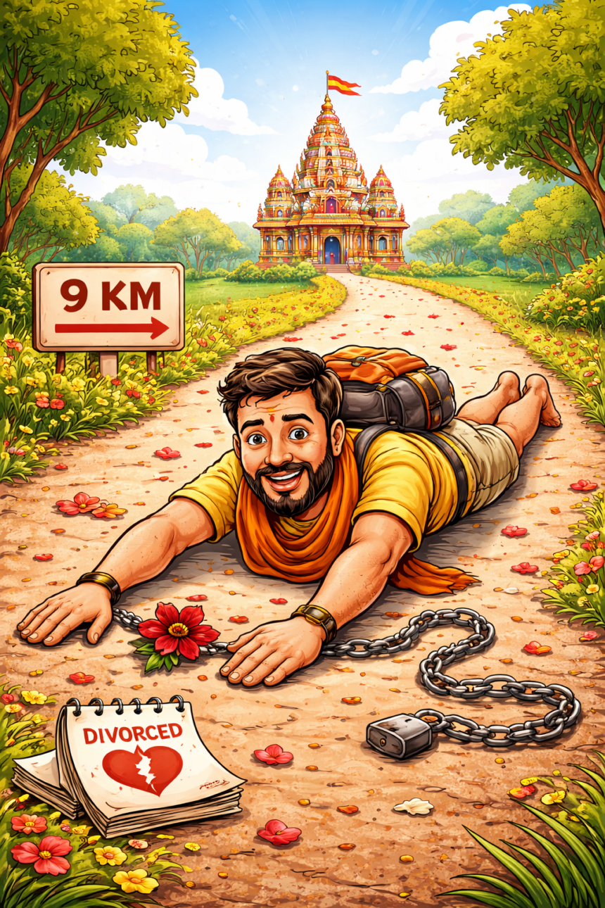 Married in 2022 amid repeated disputes, the court granted a divorce in January 2026. Vow made during marital crisis honored through full-body prostration chanting Jai Shri Ram, Jai Bajrangbali.